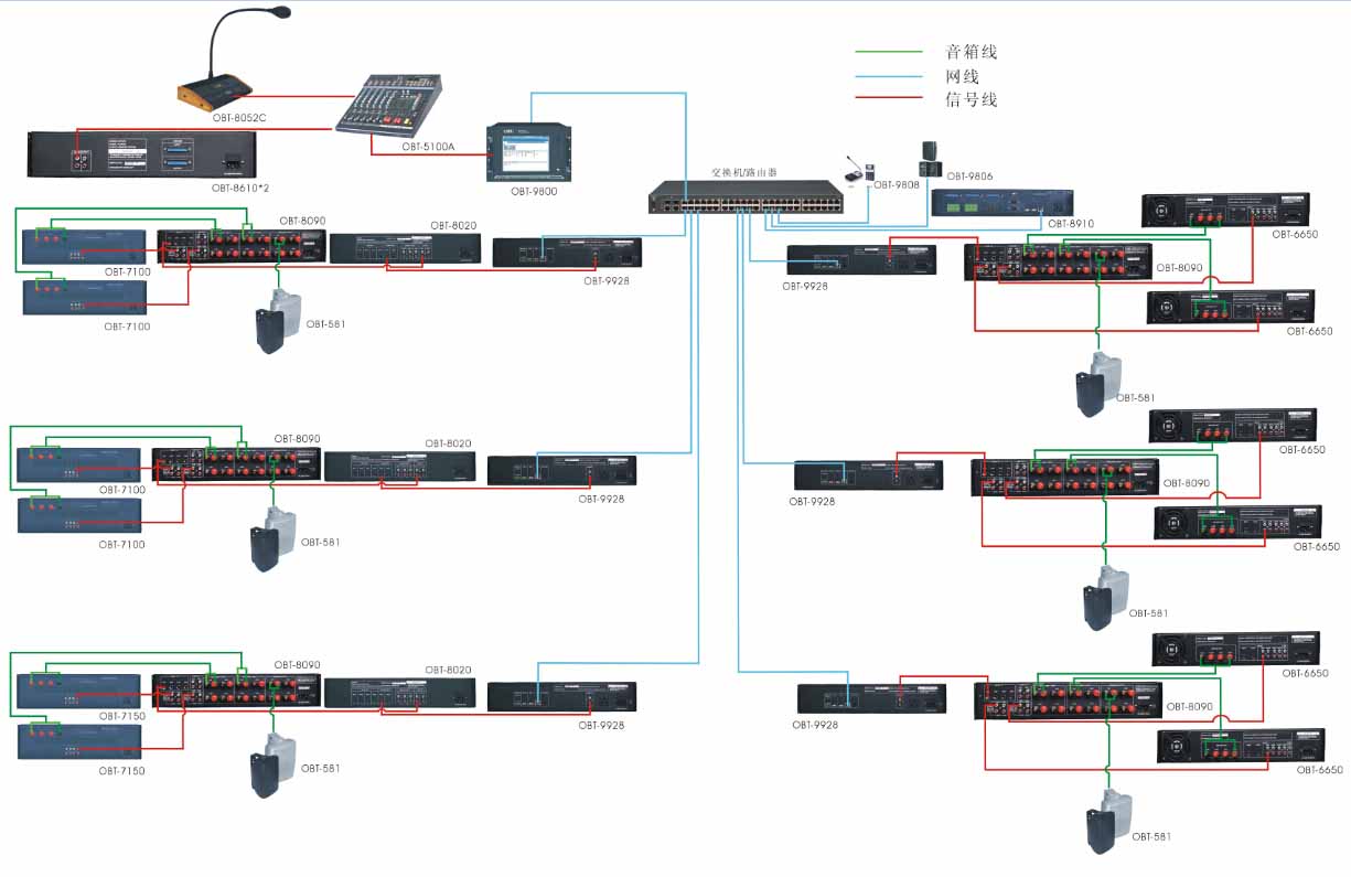 5)中心廣播機房:廣播控制室設置系統服務器OBT-9800、音源設備OBT-9708、消防連動控制設備OBT-8910、廣播尋呼話筒OBT-9808、監聽音箱OBT-9806等設備。