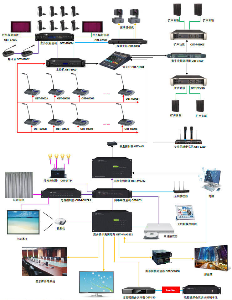 1)擴(kuò)聲系統(tǒng)設(shè)計(jì):在多媒體系統(tǒng)會(huì)議主要是以會(huì)議功能為主的場(chǎng)所,對(duì)擴(kuò)聲系統(tǒng)而言,其系統(tǒng)設(shè)計(jì)要求達(dá)到正常的標(biāo)準(zhǔn)之外,還應(yīng)考慮系統(tǒng)的兼容性、整體性、擴(kuò)展性、操作性、資源共享等問題,因而我們緊密結(jié)合建筑聲學(xué)設(shè)計(jì)擴(kuò)聲系統(tǒng),采用集中式和分散式結(jié)合的擴(kuò)聲設(shè)計(jì),使整個(gè)會(huì)場(chǎng)的聲場(chǎng)均勻,響度合適,高保真重放,無(wú)失真、嘯叫等問題。