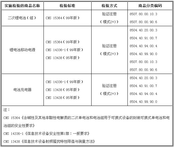 根據(jù)2013年7月26日的會議記錄,臺灣經(jīng)濟(jì)部標(biāo)準(zhǔn)檢驗(yàn)局(BSMI)將計(jì)算機(jī)、通訊和消費(fèi)電子三類產(chǎn)品(簡稱3C電子產(chǎn)品)中的二次鋰電池(組)、鋰電池移動電源和電池充電器納入其強(qiáng)制性商品檢驗(yàn)范圍,新規(guī)定將從2014年3月1日開始實(shí)施。
